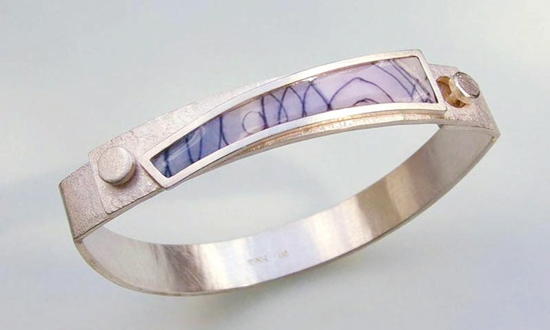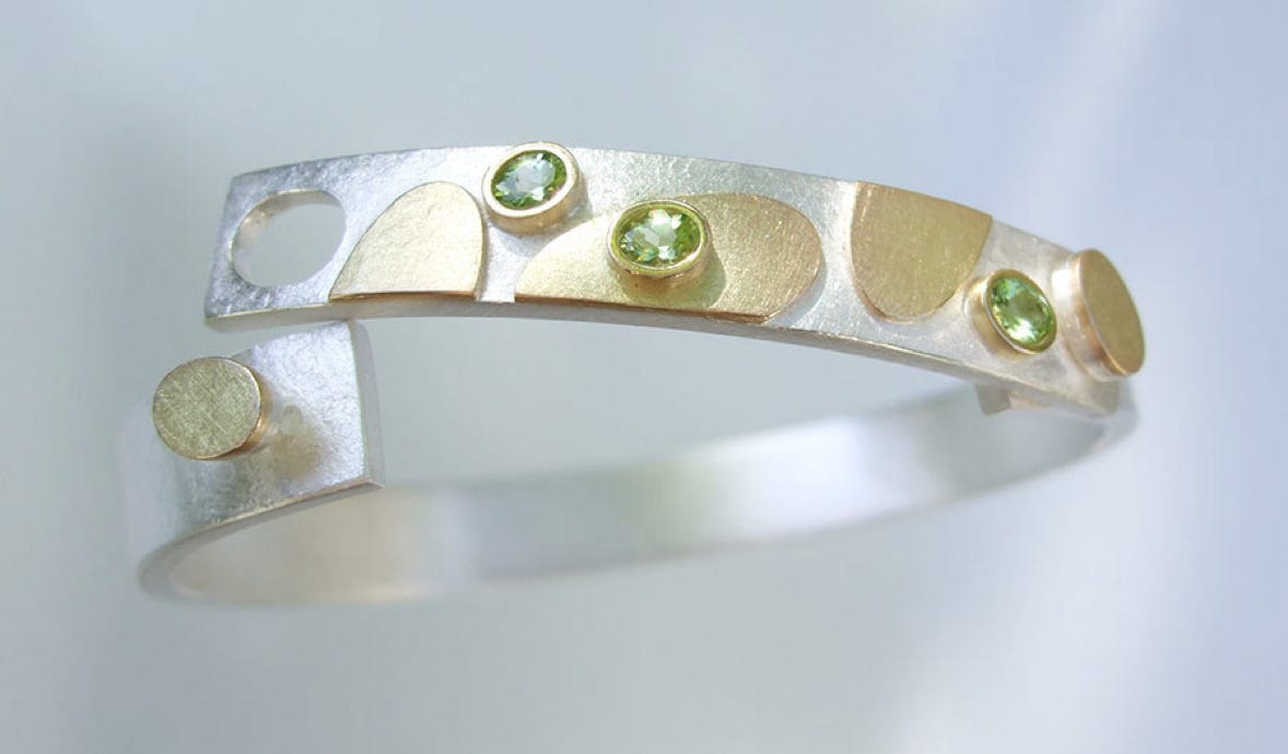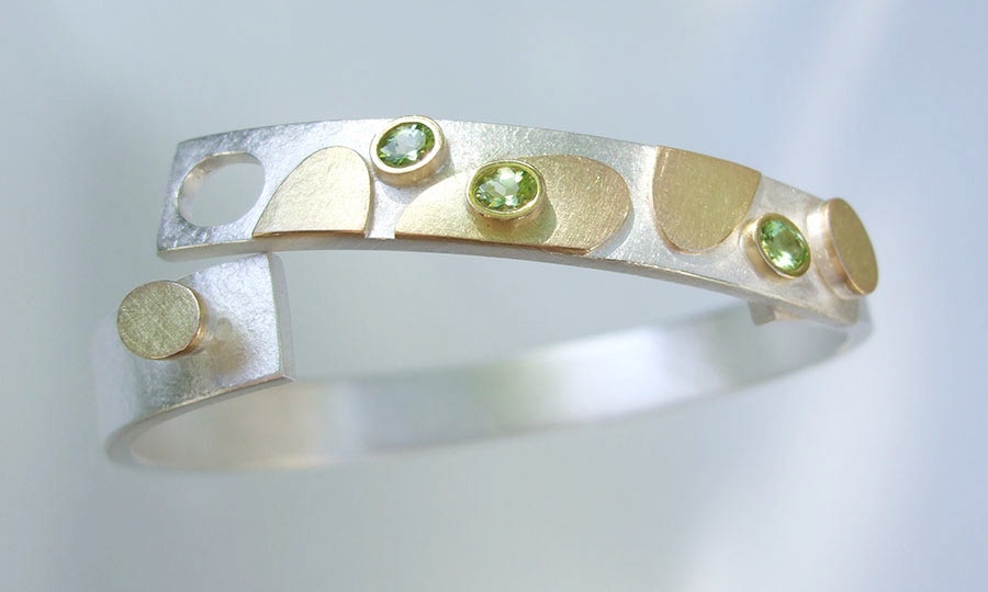 Individuell gestaltet werden die Reifen aus 750/-Gold und 935/-Silber, fein überlappend geschmiedet und damit auf Spannung gebracht,
