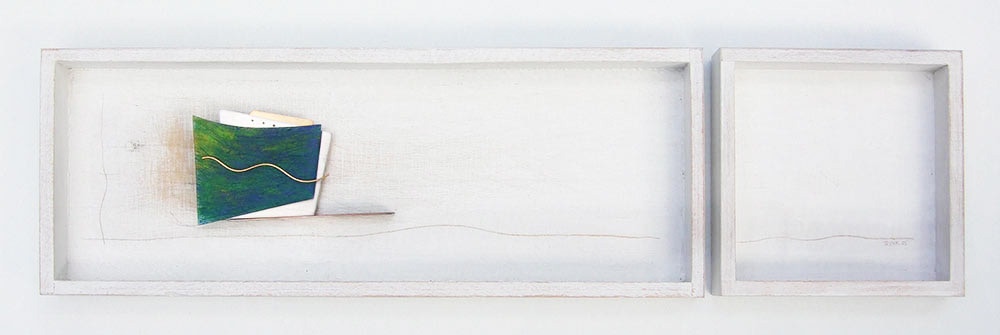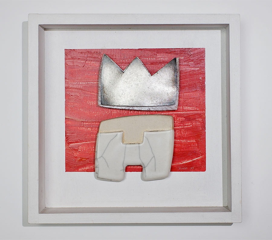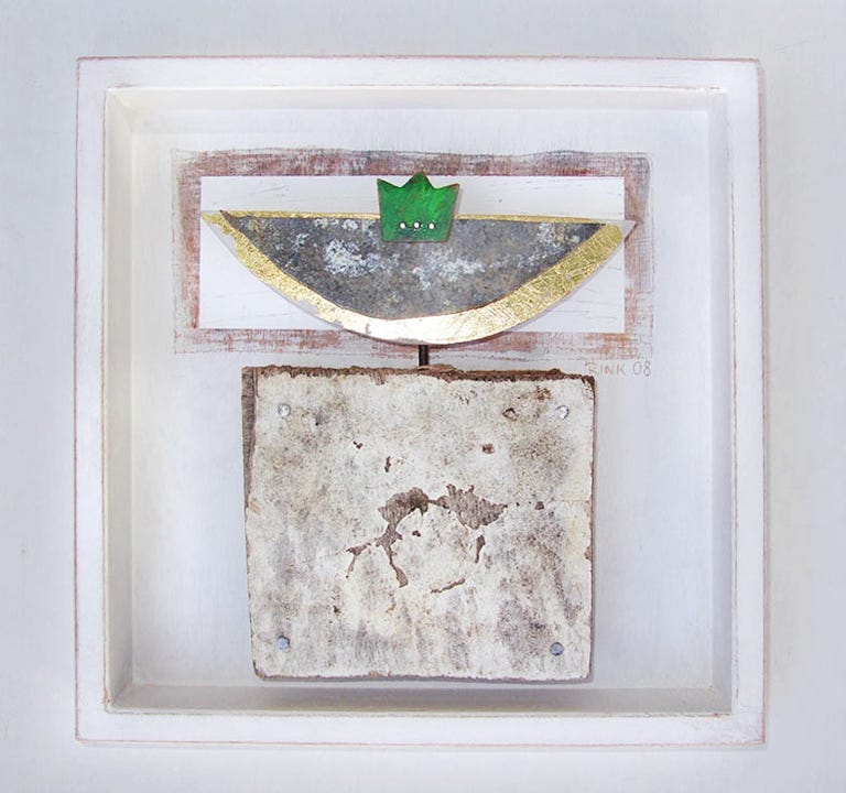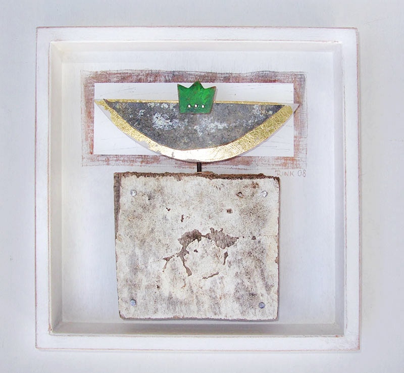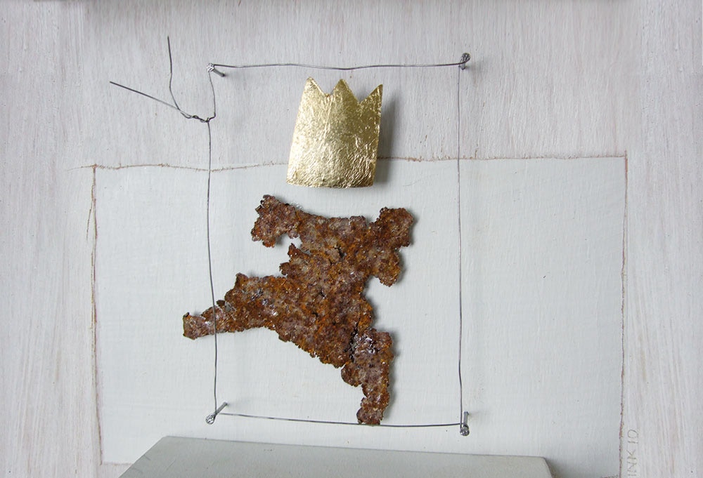 Aus einer Idee entstanden, als Hommage an meine Söhne, die Prinzen. In den Wandkästen mit Krönchen nutze ich unterschiedlichste Materialkombinationen: Silber, Blattgold, Zeichnungen, Eisen, Holz und Fundstücke...