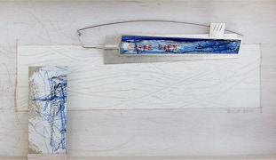 Collagen aus Fotos, Zeichnungen, Aquarell und Textil im ENSEMBLE mit Schmuck und Objekten von Petra Rink.