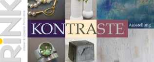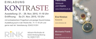 Kontrastreich mit Petra Rink: Schmuck und Objekten – Eva Kinzius: Keramik – Michaela Frank: Malerei – mit kontrastreichem Fingerfood und jazziger Sound-Kulisse.