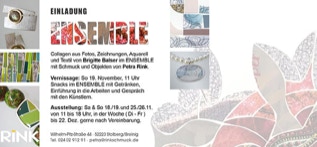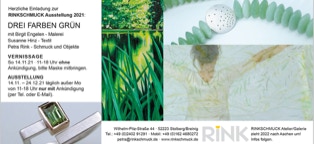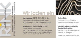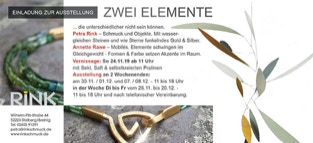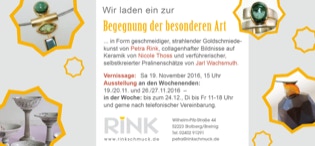 Petra Rink: Schmuck und Objekte · Irene Leister: Malerei, Keramik, Papier · special guest: Eberhard Rink mit Schmuck – In schöner Atmosphäre, Schmuckes anschauen, Leckeres speisen und Genussvolles trinken.