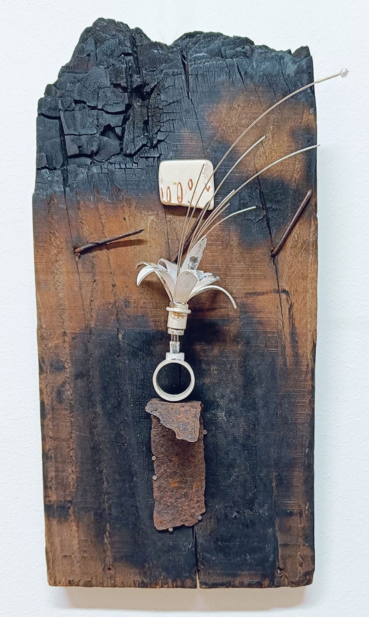 Mein Beitrag ist ein Objekt mit Ring – ein Werk ins Feuer genommen, die Spuren der Hitze auf dem Ring belassen und mit spritzigen Fundstücken ein Feuer-Werk-Objekt erschaffen.